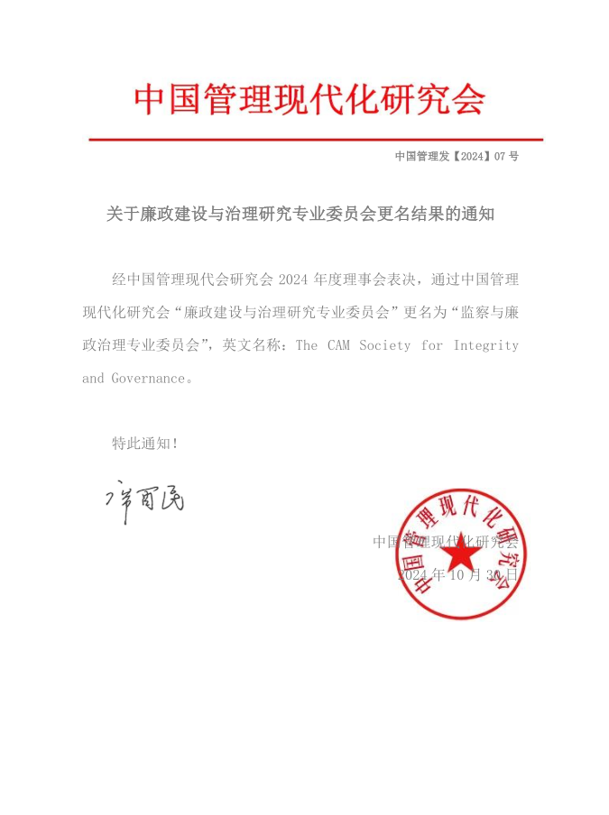 关于廉政建设与治理研究专业委员会更名结果的通知