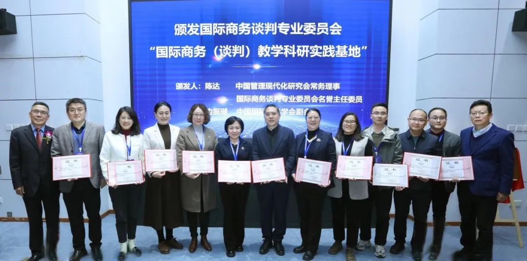 中国管理现代化研究会常务理事、国际商务谈判专业委员会名誉主任委员陈达,中国国际贸易学会副会长边振瑚共同颁发了“国际商务(谈判)教学科研实践基地”。